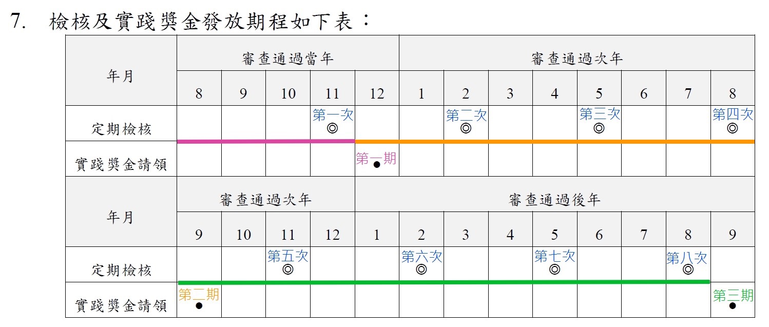 1、實踐獎金分3期撥付,青年通過第1次定期檢核,得請領第1期獎金。通過第2至第4次定期檢核,得請領第2期獎金。通過第5至第8次定期檢核,得請領第3期獎金。 (如計畫附圖)